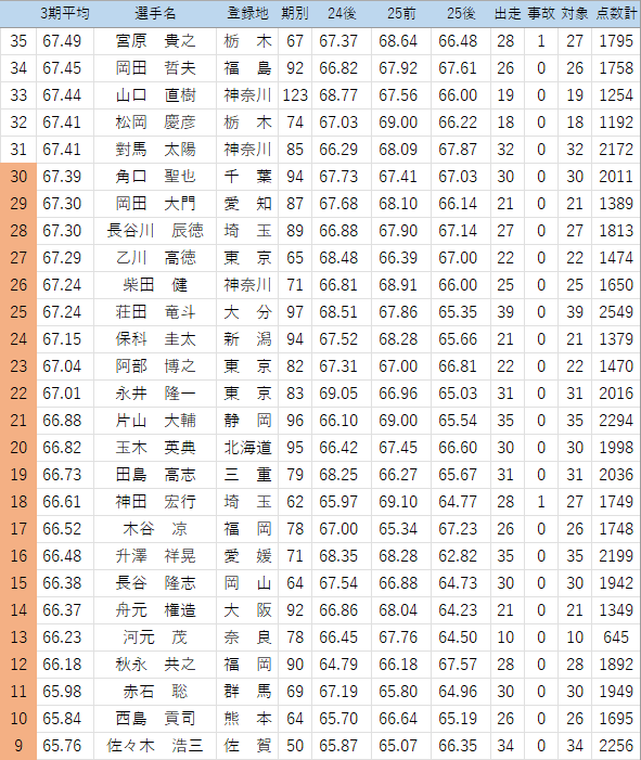 この争いを切り抜け続けている宮原だが今期は苦戦、しぶとい走りはできているが、これまでだったら届いている、凌げている直線で1つ着の悪くなるレースが…今期点数に現れている印象。ここは三浦の3番手で前受けの中岡相手だと…だが、実力者渡邊の後ろは良い位置で勝ち上がれなくとも前に食らい付いて5…4着は取りたいレース。例えば443でも67.57まで上がります。