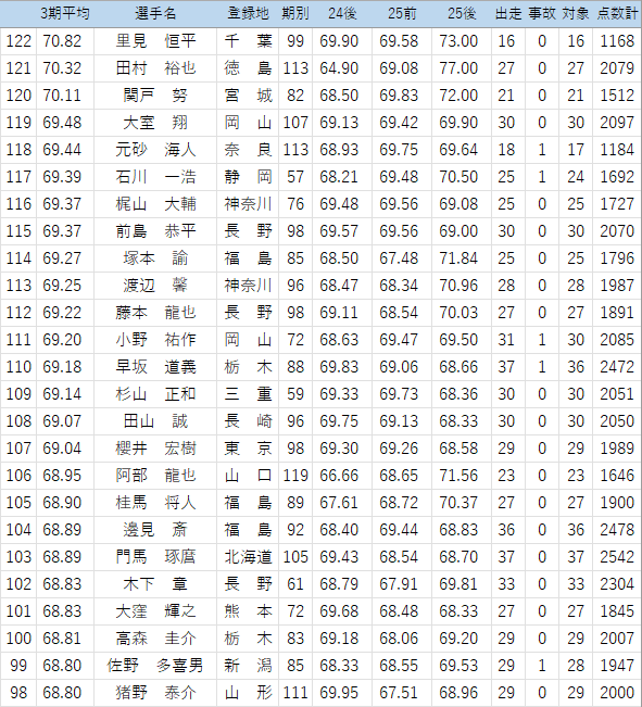 對馬太陽が465で降下。予選は本線野中龍之介の3番手も押さえ出たところ番手高木隆弘がイン待ち伊藤之人に粘られ…この時点で苦しいが野中が最終H2車出させてのまくり展開で4着一杯…これで一般回りになるのが4R制の厳しさ。負け戦2走も点数・格が上の選手いて3番手回り、2日目はラインの目標が上昇を突っ張られたところ降りてしまい再度の仕掛けに遅れ、最終日はラインの目標がカマシ2車に追い付けず…2日目は追走決めたとしても飛び付かれていそうで、難しい3日間だった印象。地元でこの結果はキツイ…デキ自体は(判断難しいが)変わらずだったと思います。