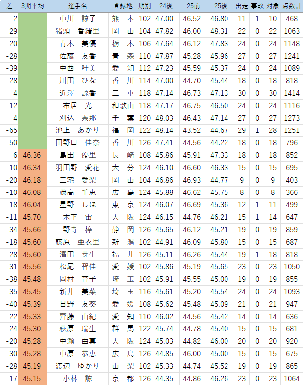 やはりというか、大きく動いています。これまでは争っていても数名だったり、数字的には接近していても…でしたが、今期は点数を取るべくの意識強く伝わる選手多く、実際ボーダーも上昇傾向です。
