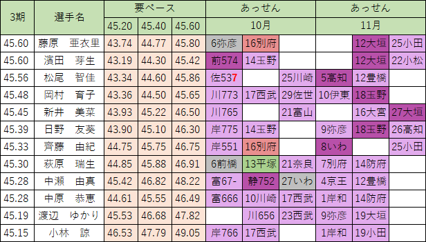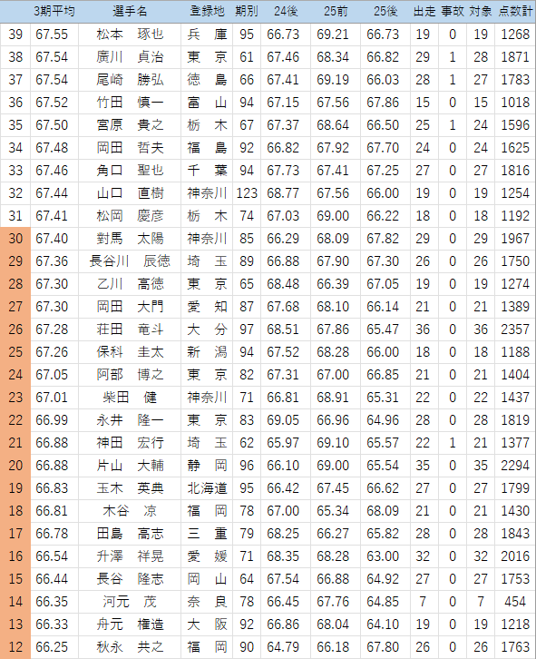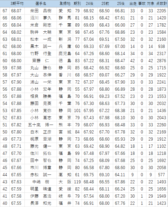 現状3期66点台の中で可能性…としたら河元選手でしょうか。兆しは出てきており、上向くと11月は稼げそうなあっせんに見えます。