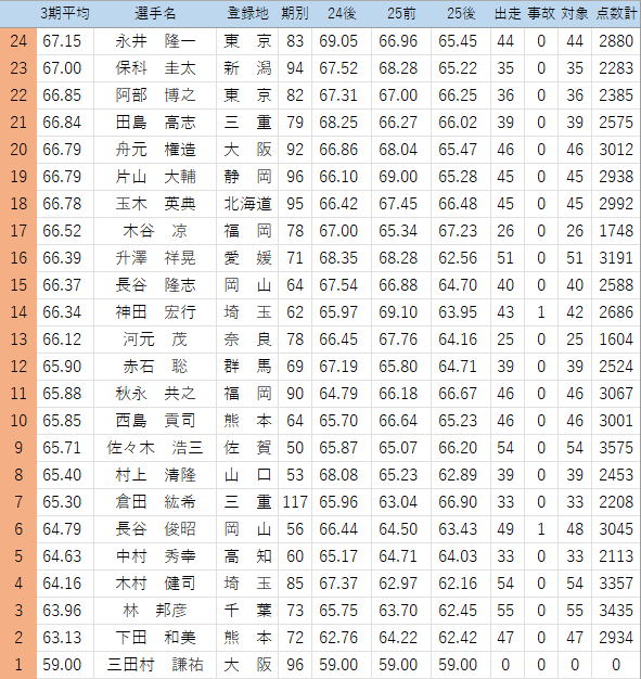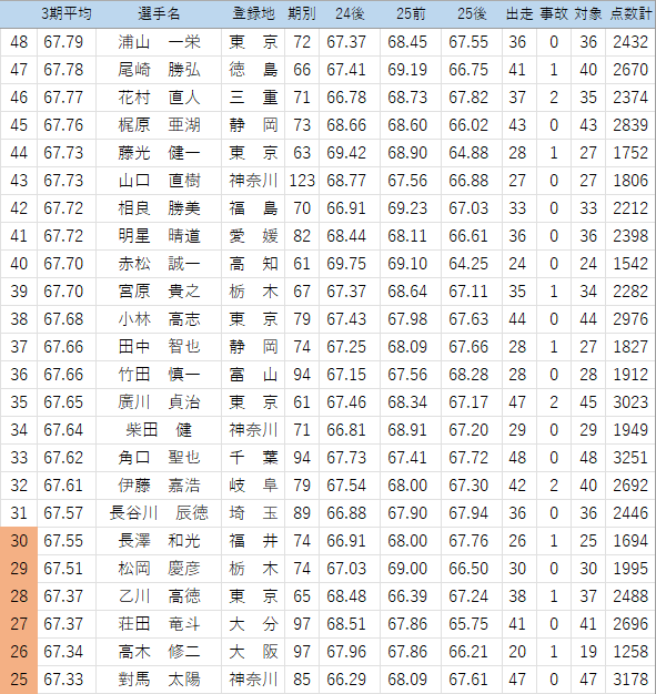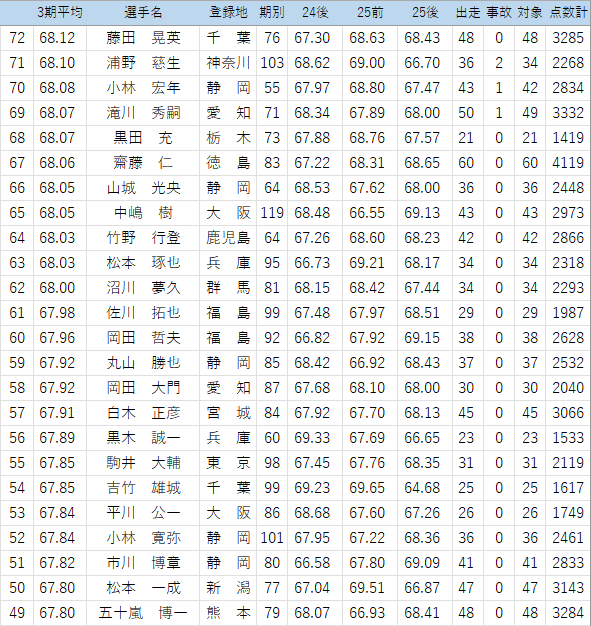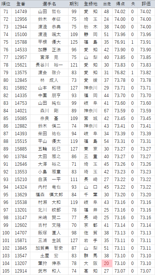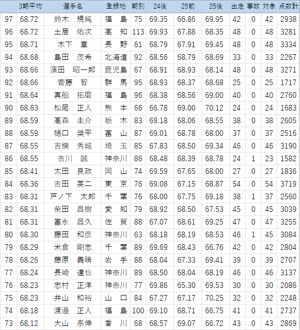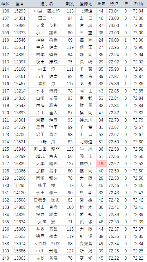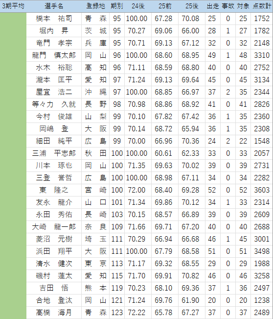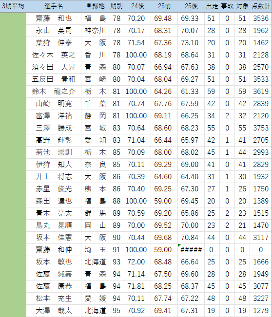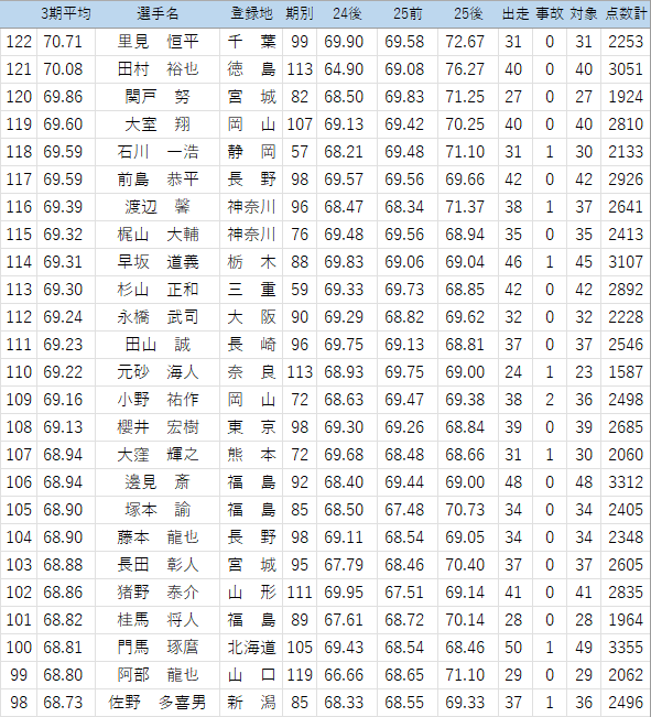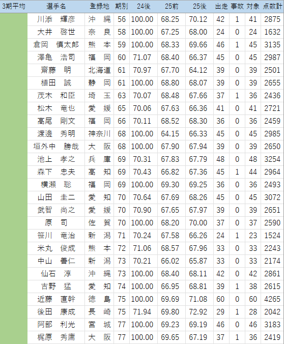 ペナルティで出走回数不足の選手も入れての順位ですので、実際はこれより何位かは上になると思います…。