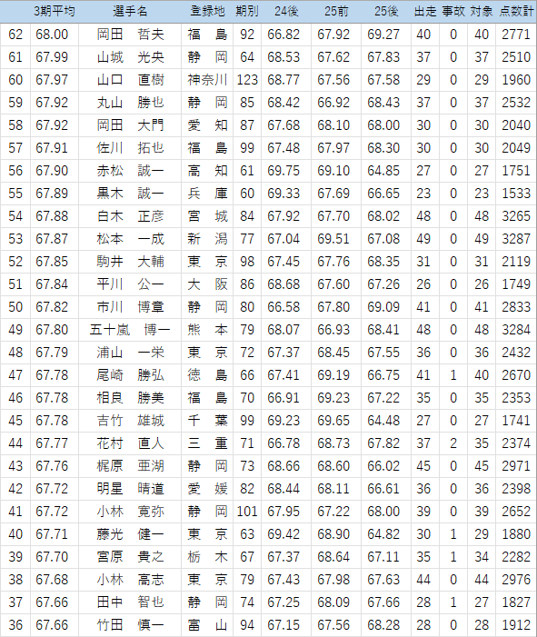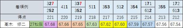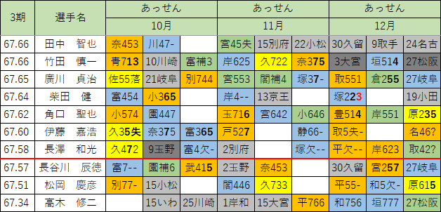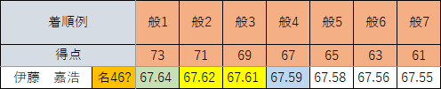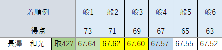 これで長澤は今節max67.64となり、67.65以上はセーフと思われます。