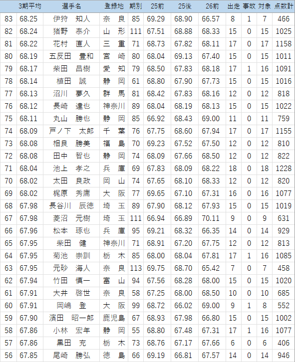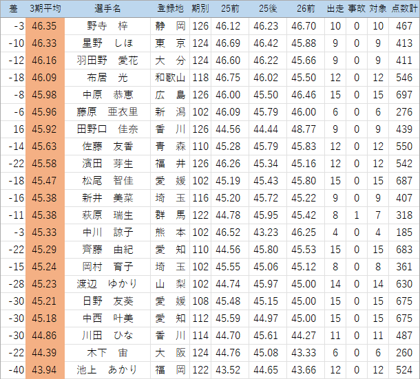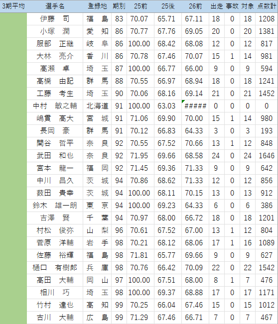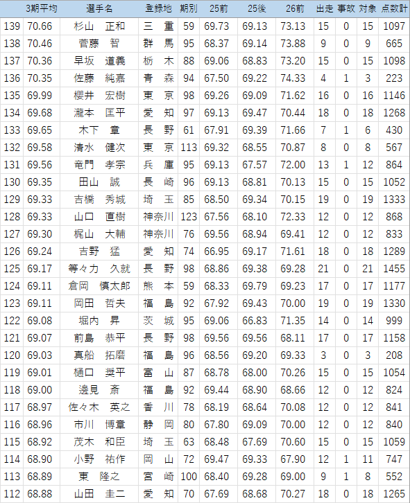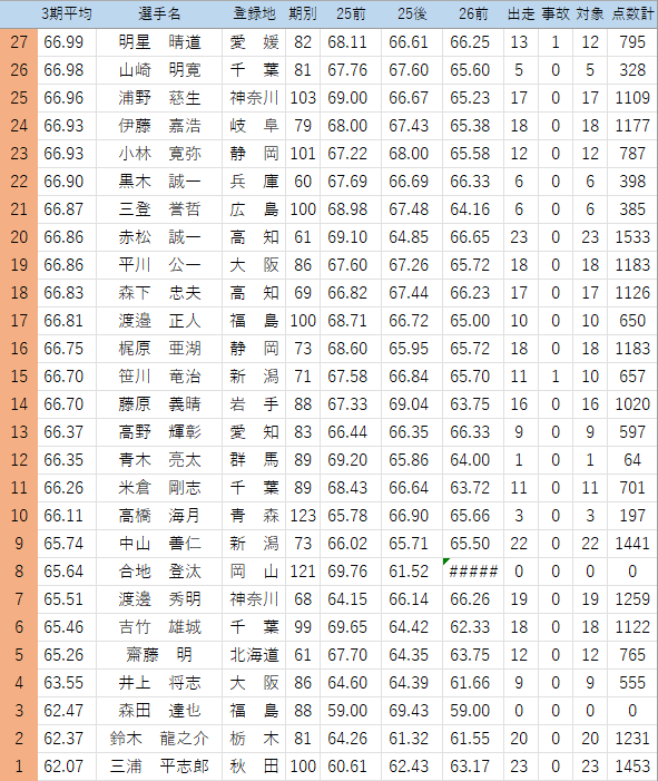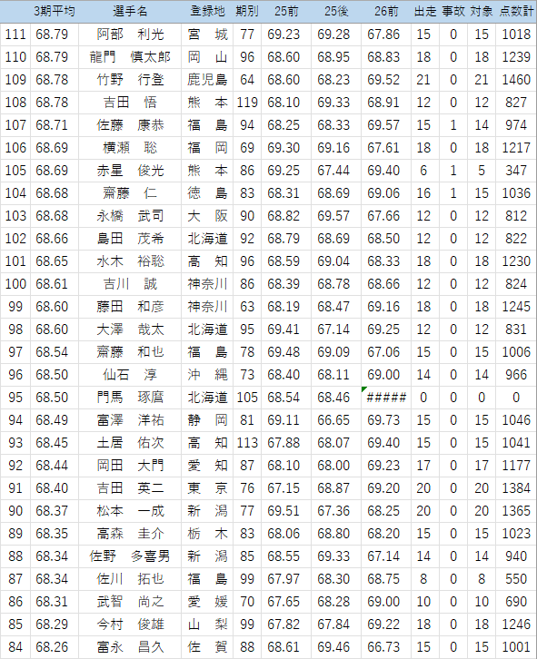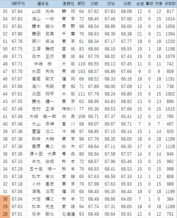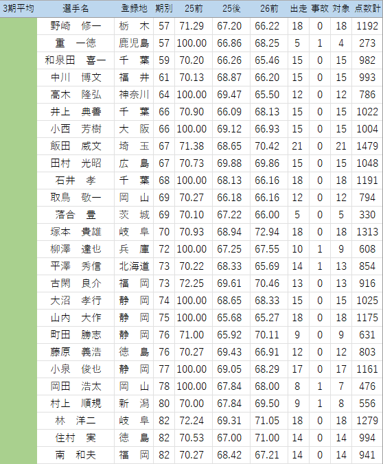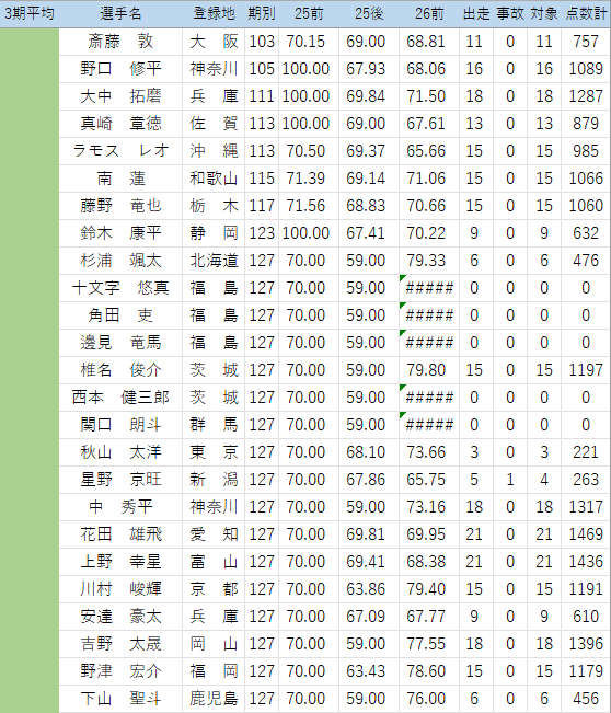(このくらいの時期から出走回数不足の危険ある選手をチェック…25年後期は見落としたので気を付けます。佐藤純嘉は1/25防府でかなり厳しそうな落車で欠場中、心配です)